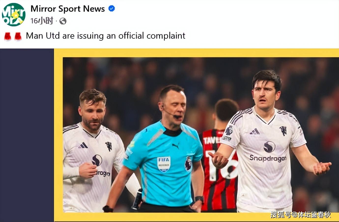 当然,即便投诉也改变不了比分结果。英超联盟明确规定,赛果不会因为申诉而改写,马奎尔的红牌大概率也不会撤销。曼联高层心里也清楚这一点,坚持投诉只是在表达一种态度,现在英超争四的竞争非常激烈,希望接下来的比赛别再出现这种令人抓狂的判罚。